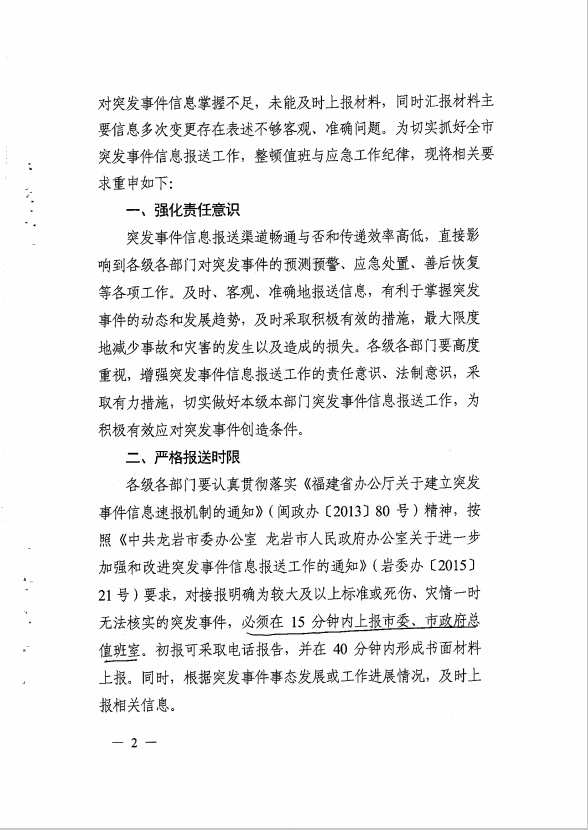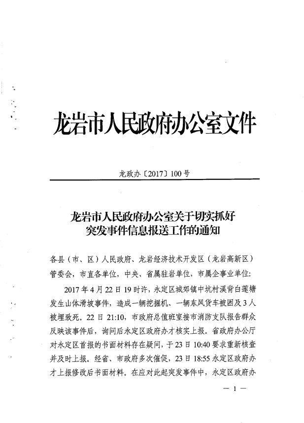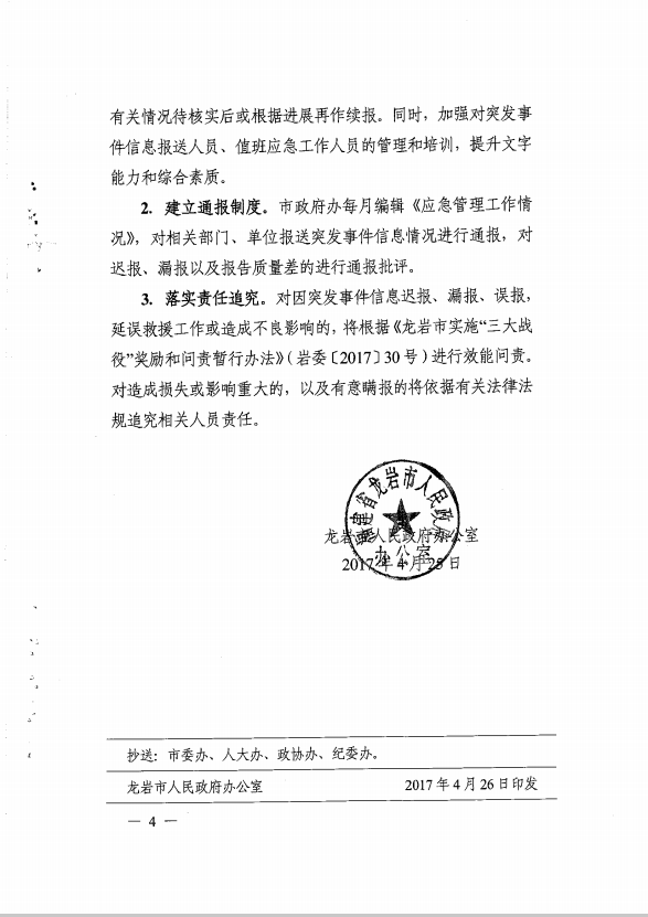 市政府辦關(guān)于切實(shí)抓好突發(fā)事件信息報送工作的通知(龍政辦【2017】100號)
